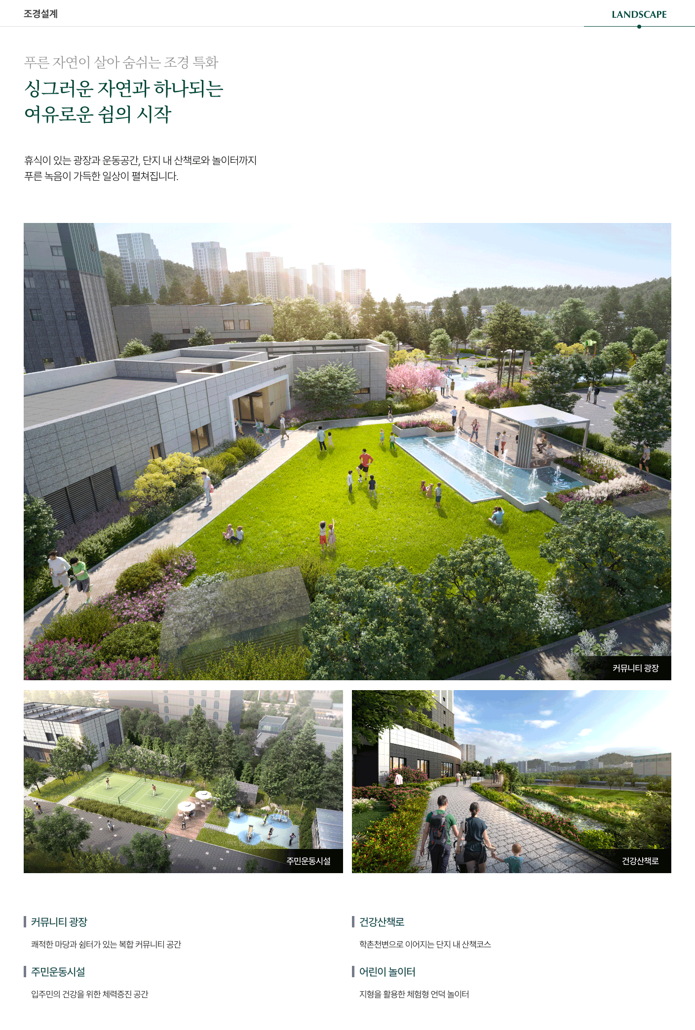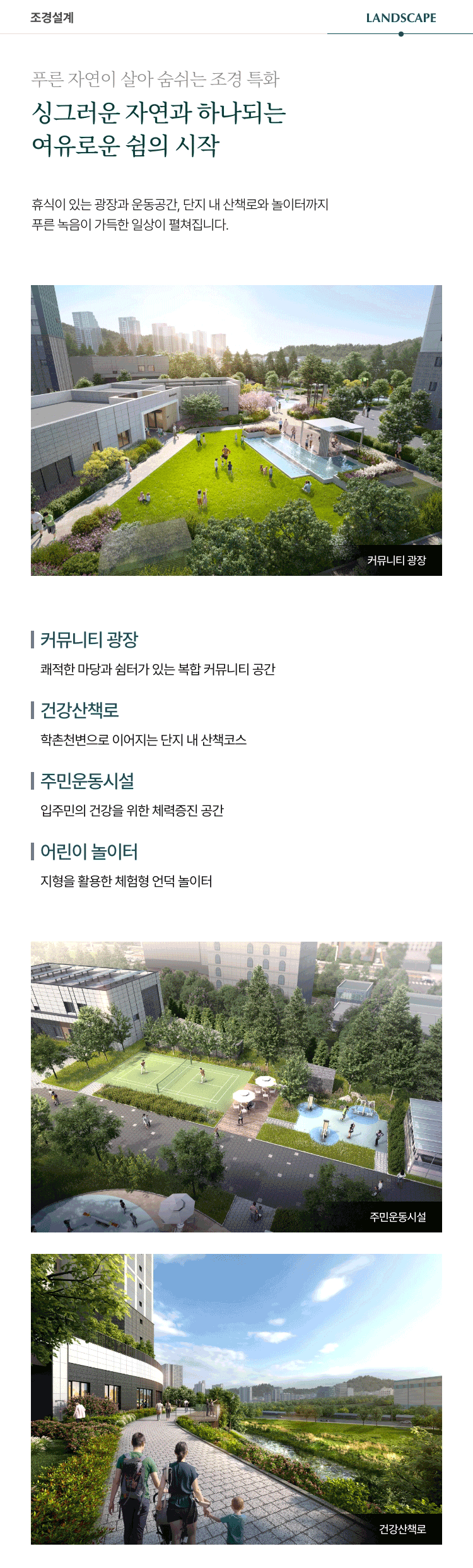 LANDSCAPING 단지조경 HOME 단지안내 조경설계 상기 이미지는 소비자의 이해를 돕기 위한 것으로 실제와 차이가 날 수 있으며, 건축물의 외관 및 색채계획은 변경될 수 있습니다. 또한 조경 시설물과 식재는 실제와 다를 수 있습니다.